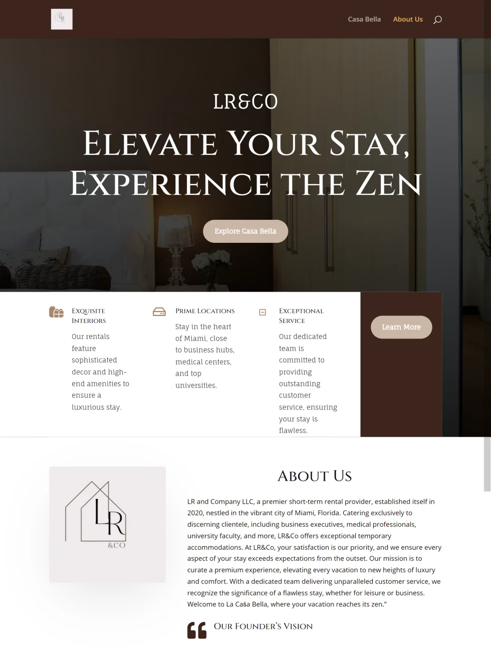 LR&Co (LR and Company LLC) is a premier short-term rental provider based in Miami, Florida. LR&Co offers high-end, meticulously designed rental properties that combine luxury with convenience. The client sought a website that would reflect the elegance and comfort of their properties while providing potential guests with an intuitive and seamless browsing experience.